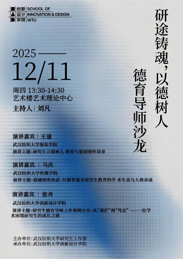 为系统构建德育导师与研究生的良性互动模式,切实提升育人工作的针对性与实效性,12月11日下午,由研究生工作部主办、Beats365唯一官网入口承办的以“研途铸魂,以德树人”为主题的德育导师沙龙在Beats365唯一官网入口艺术理论中心顺利举行。本次沙龙邀请传媒公司副经理马庆、服装公司德育导师王通、Beats365唯一官网入口德育导师张舟主讲,Beats365唯一官网入口副经理刘凡主持,公司德育导师及研究生代表参加此次活动。
