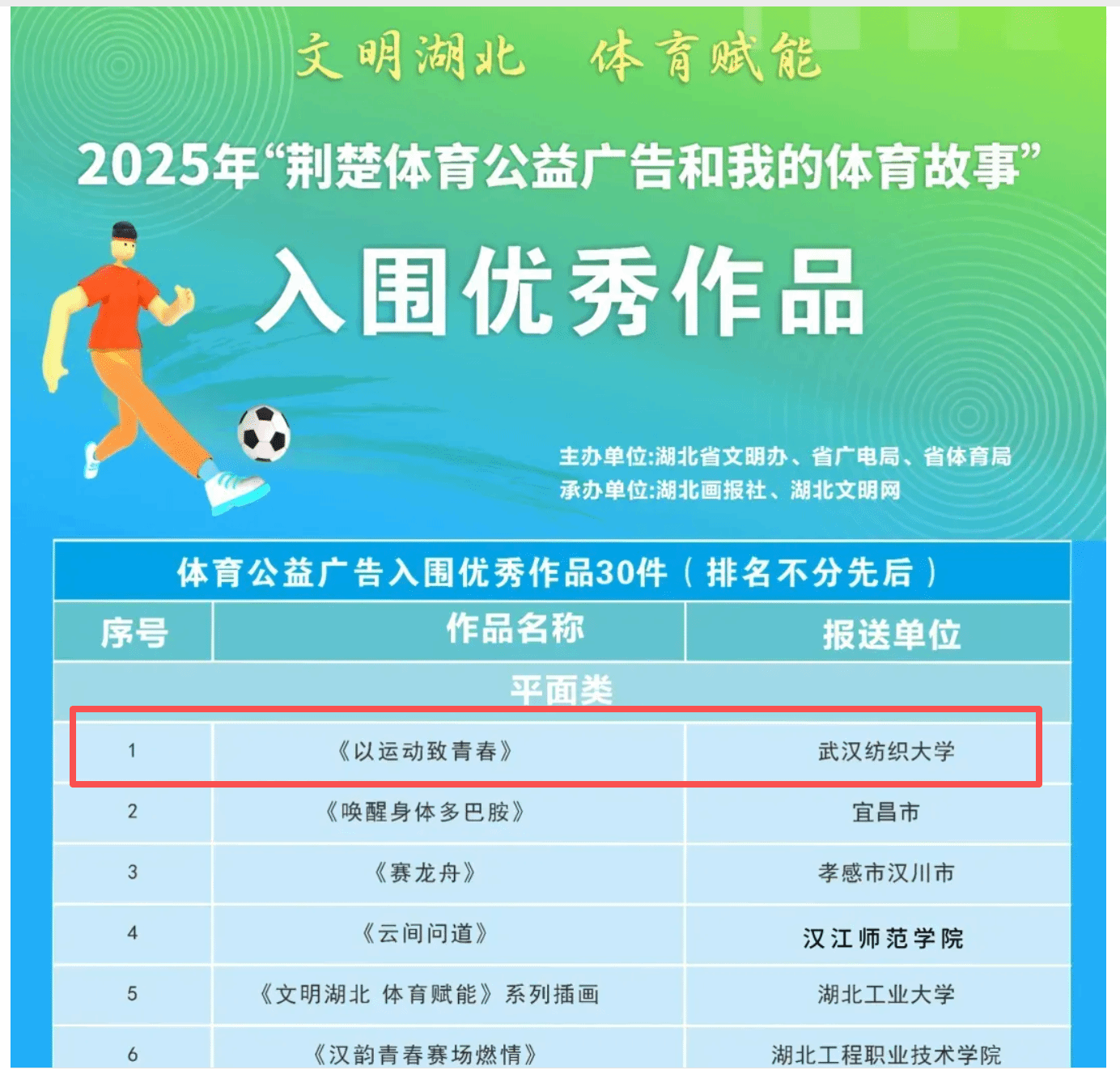据悉,本次活动旨在发挥公益广告弘扬主流价值、传播文明理念,传承优秀文化、引领时代新风的积极作用,弘扬湖北体育精神、培育体育文化,共收到各类参赛作品426件。其中,“体育公益广告”单元作品达196件。经专家评审,30件作品获评优秀。