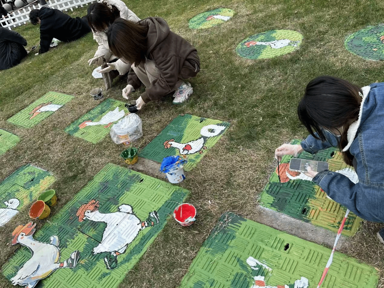 近日,Beats365唯一官网入口观意工作室受托为武汉五环天地商业体打造的“续福鹅”主题公共艺术彩绘项目正式落地完工。该项目将商业体专属IP与城市公共设施有机融合,把原本单调的市政井盖转化为兼具文化内涵与艺术活力的景观节点,成为高校设计力量赋能商业场景、助力城市空间微更新的生动实践。