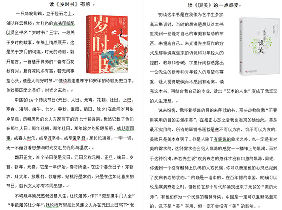 例如,设计学11901班唐龙同学分享书籍《谈美》,作为美术生的他,在读完这本书后,对他的专业有一定的启发;设计学11907班周荣先同学分享书籍《岁时书》,全方位展现独一无二的中国节日之美,她着重讲述了元日(春节)这个节日期间的所思所想。