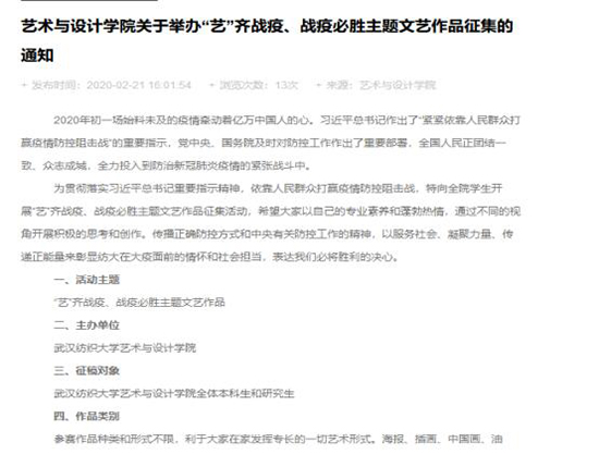 2020年武汉的春天不同于往年,整座城市都在抗击新冠病毒,一场“看不见的战争”席卷全国。原本最热闹最喜庆的春节假期仿佛被按了暂停键。新冠肺炎疫情成了14亿国人最深切的牵挂。在武汉封城的近一个月的时间里,Beats365唯一官网入口全体师生主动出击,同心战“疫”,为打赢疫情防控攻坚战贡献“艺”力。
