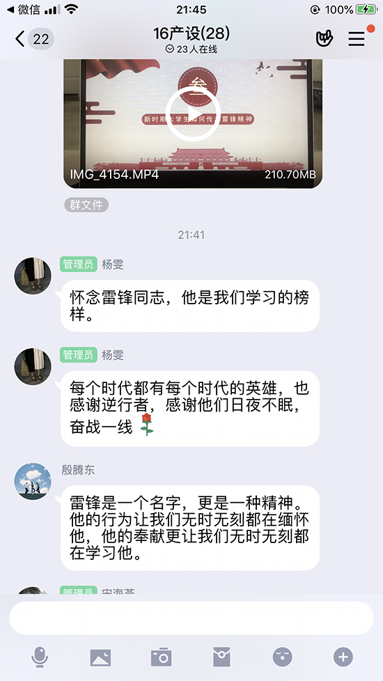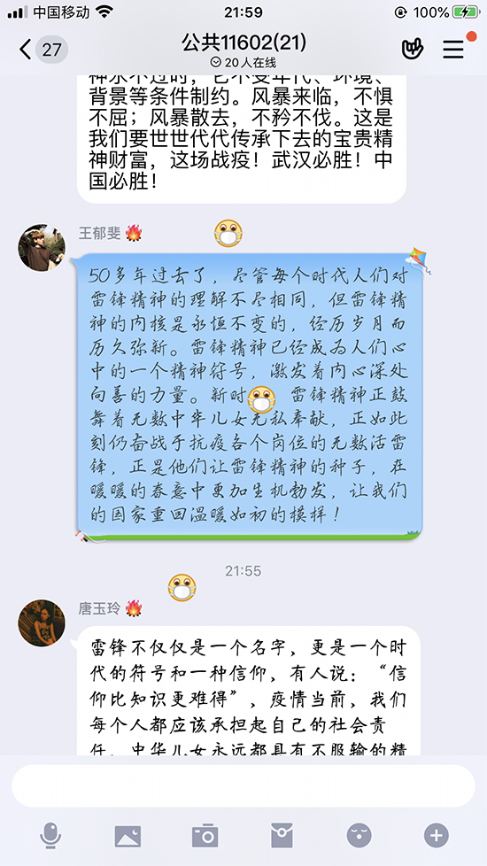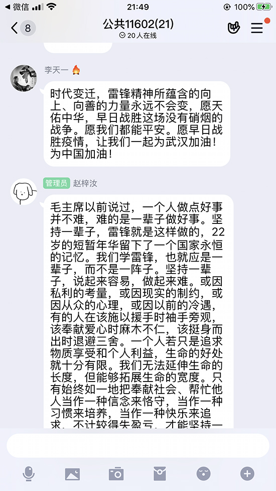 本次班会主题是“传承新时代雷锋精神”,由年级辅导员张舟老师录制网络班会视频,同步学习;张舟老师从新时期雷锋精神说起,结合近期抗击疫情中涌现出来的英雄人物事迹以及志愿者事迹诠释新时期雷锋精神,又以战斗在一线的师生代表为案例告知员工新时期如何传承雷锋精神。