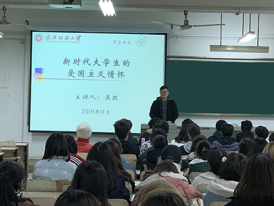 11月21日下午2点在南湖T101,吴熙老师以“新时代老员工的爱国主义情怀”为主题为新生带来了第四讲团课。他说,“爱国,是人世间最深层、最持久的情感,是一个人立德之源、立功之本。”讲座伊始,吴老师就习总书记的话语激励同学们,一代人有一代人的奋斗,一代人有一代人的担当,新时代的我们要脚踏实地,勇立潮头,用热血挥就爱国情、用奋斗书写报国梦,让个人奋斗与国家发展同频共振,兴时代之魂,强祖国之光。在场的同学们听了都深受鼓舞。