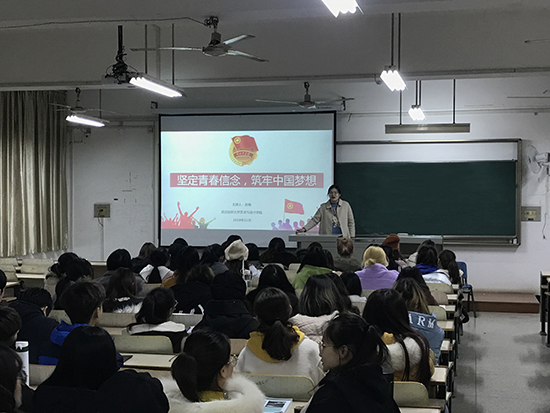 11月18日晚七点在南湖T101, 张瑜老师开展了以“坚定青春信念,筑牢中国梦想”为主题的团课活动,着力推进“两学一做”精神进支部、进社团、进网络、进团课,在团课开展的过程中,加强同学们要树立理想信念,勇担责任的思想教育工作,同学们充分认识到:要坚定理想信念,练就过硬本领,在激情奋斗中绽放青春光芒,在追寻中国梦的征途中放飞青春梦想。