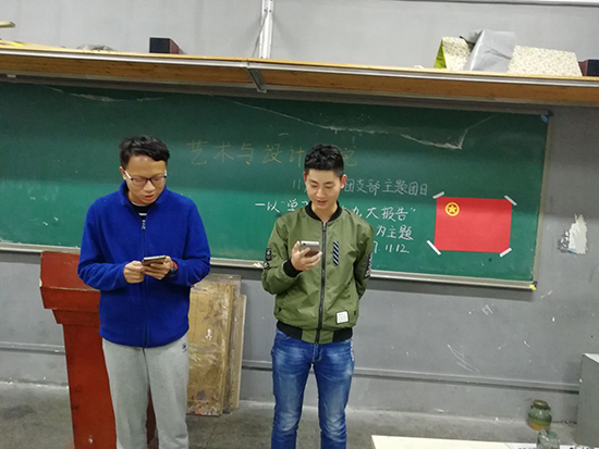 各团支部以小组的形式开展了十九大学习交流,来自环艺11601班的吴疆同学发言说,作为一名新时代的老员工,要将十九大精神贯彻到我们的学习、生活和工作中,加强团员的政治意识,提高团员的思想觉悟,在团员中树立典型,彰显新时代老员工的特点。来自设计学11705班的许森宇同学发言说,前不久观看了十九大报告现场直播,作为新时期的老员工我感到无比的自豪,但同时也能感受到身上的压力,一个民族的伟大复兴是需要一代代青年共同的努力和奋斗,这使我对自己在今后的学习、生活和工作中将更加严格,为实现中国梦奋斗终身。