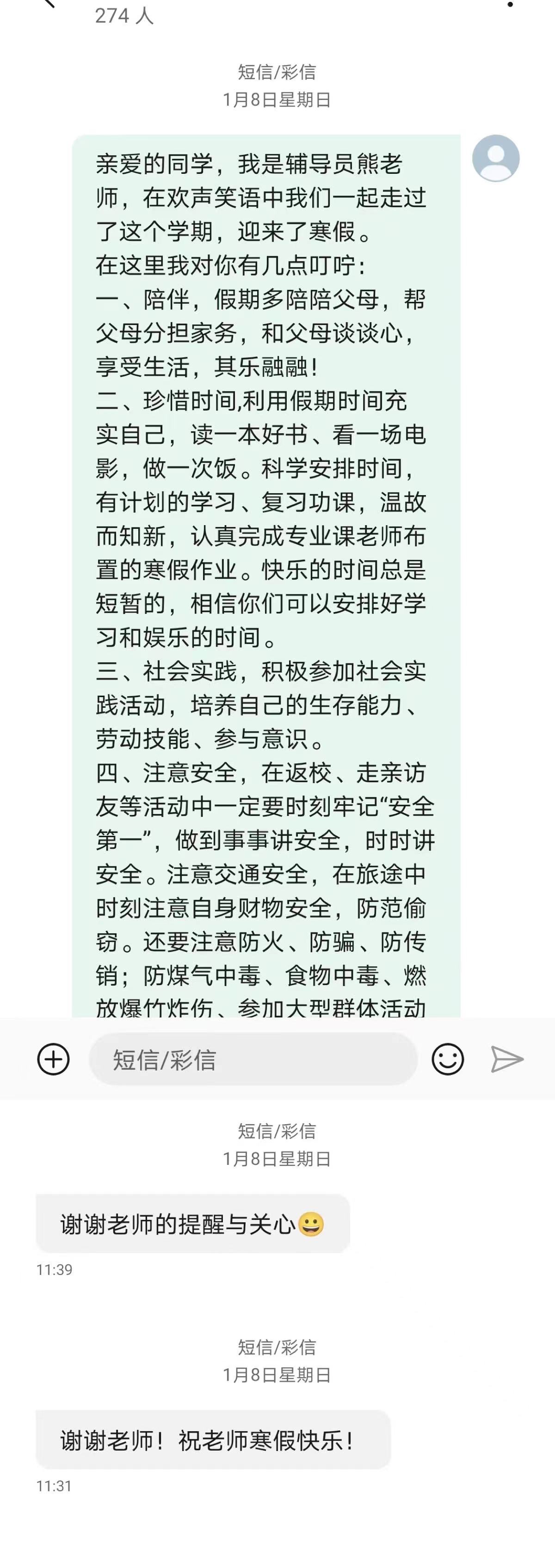 2022级本科生辅导员熊潇潇勉励同学们积极参与公司、公司组织的各项假期活动,丰富假期生活。