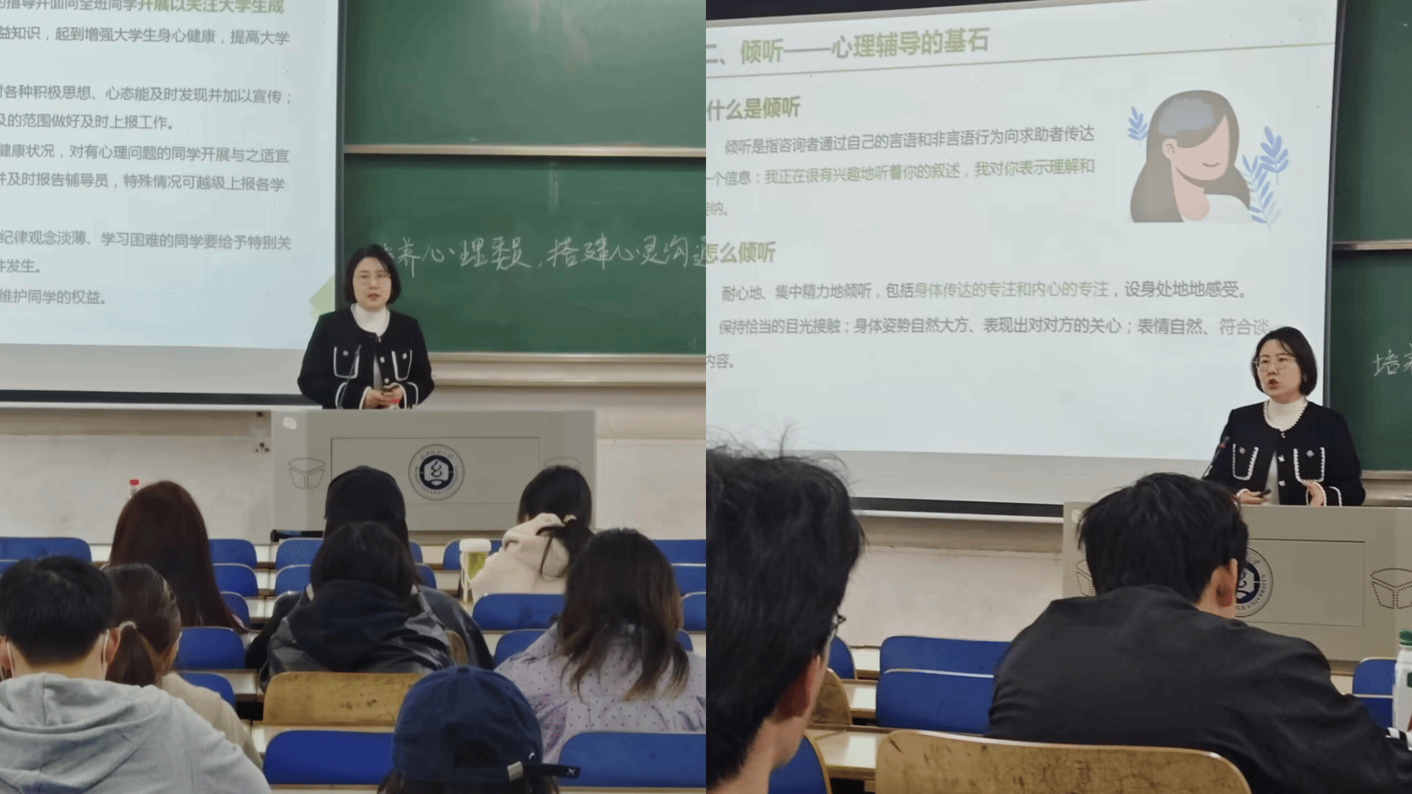 培训伊始,江秋玮老师强调了此次心理培训的重要性,介绍心理委员定位,明确工作职责及要求。并通过案例分析的形式带领大家了解不同心理问题的案例,帮助心理委员掌握心理问题识别技巧,及时有效的识别有潜在心理困扰的同学,分享了如何从情绪以及行为表现两个角度判断哪些同学是需要重点关注的对象。江秋玮老师建议使用尊重、真诚和共情三个法则进行疏导。同时,提醒大家及早识别,提前介入,及时反馈。