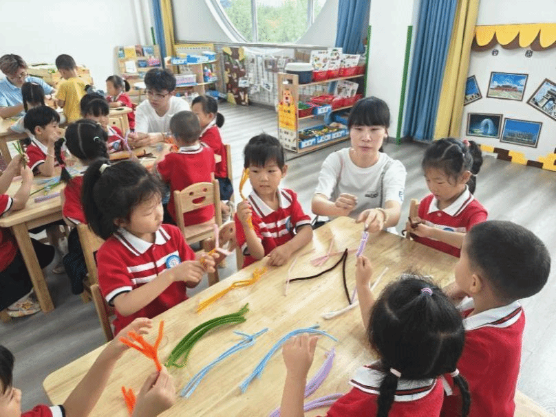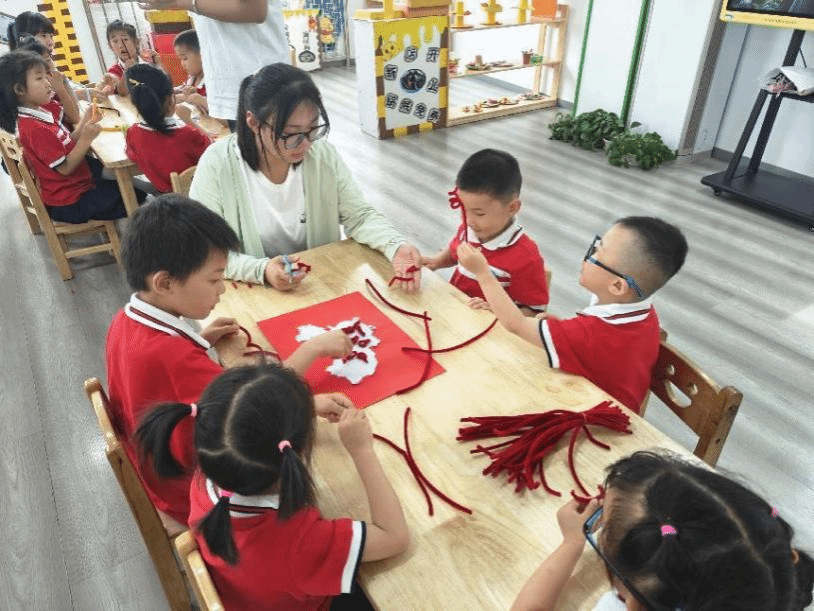 下午红色文化探索课程,小朋友们以小组为单位,用扭扭棒组合成了一副副被鲜花环绕的中国地图。本次课程借助扭扭棒作为探索的媒介,让孩子去动一动、玩一玩,让他们在扭一扭的过程中充分想象创造。该课程将美育融入公司产品,能增强孩子们的爱国意识。