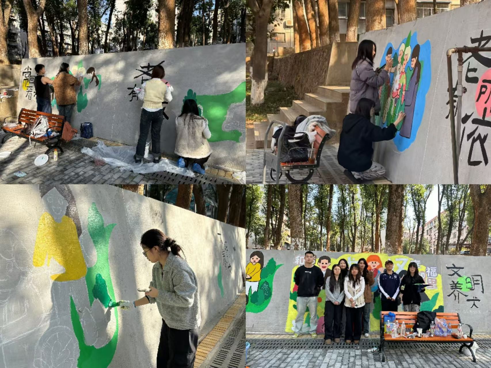 活动一开始,大家便热情高涨地投入到前期准备工作中,他们精心调配颜料,小心搬运绘画工具,细心用废弃报纸保护周围环境。紧接着,同学们将水泥墙和石墩视作创作的画布,巧妙地将彩绘图案与引人注目的标语融为一体。在绘画过程中,大家各司其职,从起稿、上色、勾线到相互协助、帮忙传递工具,整个流程井然有序。随着画布上图像逐渐成形,每个人的脸上都洋溢着喜悦之情,心中充满了成就感。