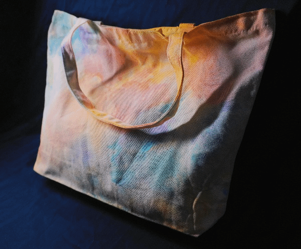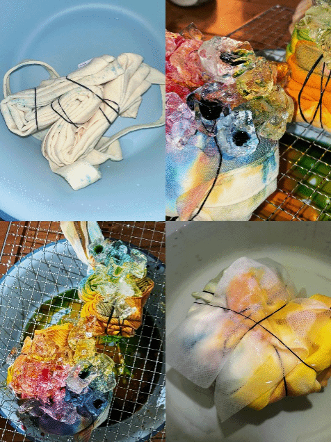 精心挑选天然织物,将其用皮筋绑起来。把环保染料巧妙地涂抹、滴洒在冰块上,随心创造色彩布局。重头戏是引入冰块,让其慢慢融化,冰冷的水流带着染料在织物上缓缓晕染、渗透、扩散。在低温与染料的微妙作用下,自然形成如雪花飘落般的绝美图案,就展现了出来,并且因冰的不确定性,每一件都有着独一无二的纹理与风貌,尽显自然之力与手工之美的完美融合。每一件制品也都体现了同学们在制作过程中的细心晕染与认真创作。