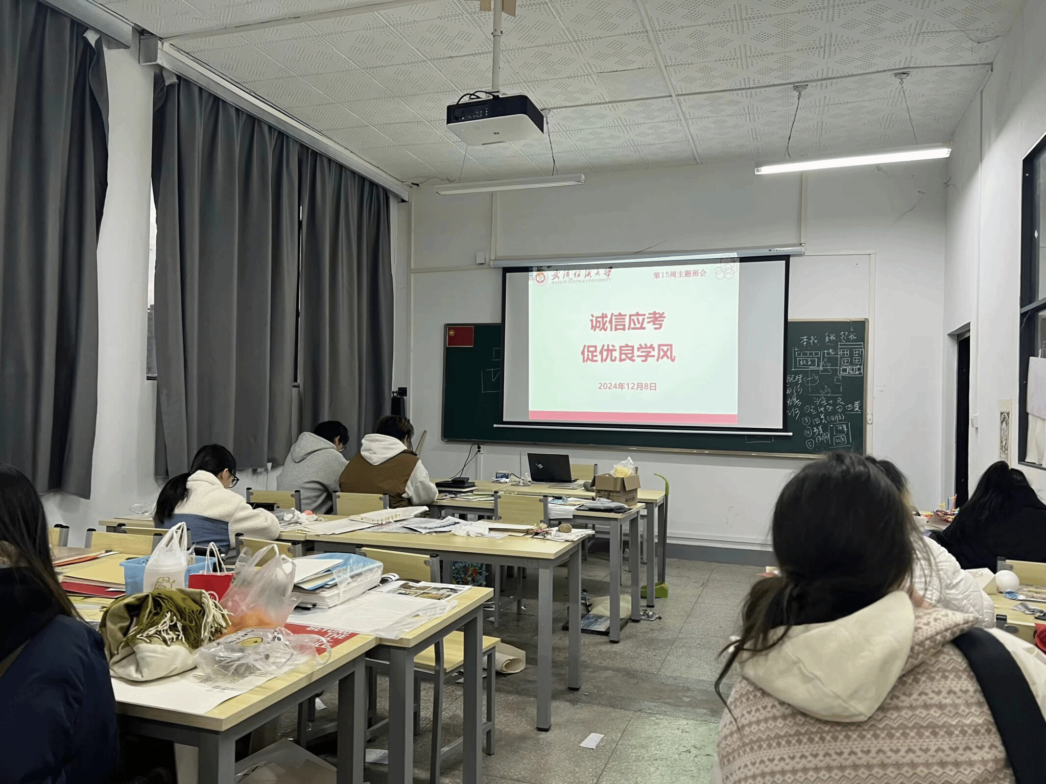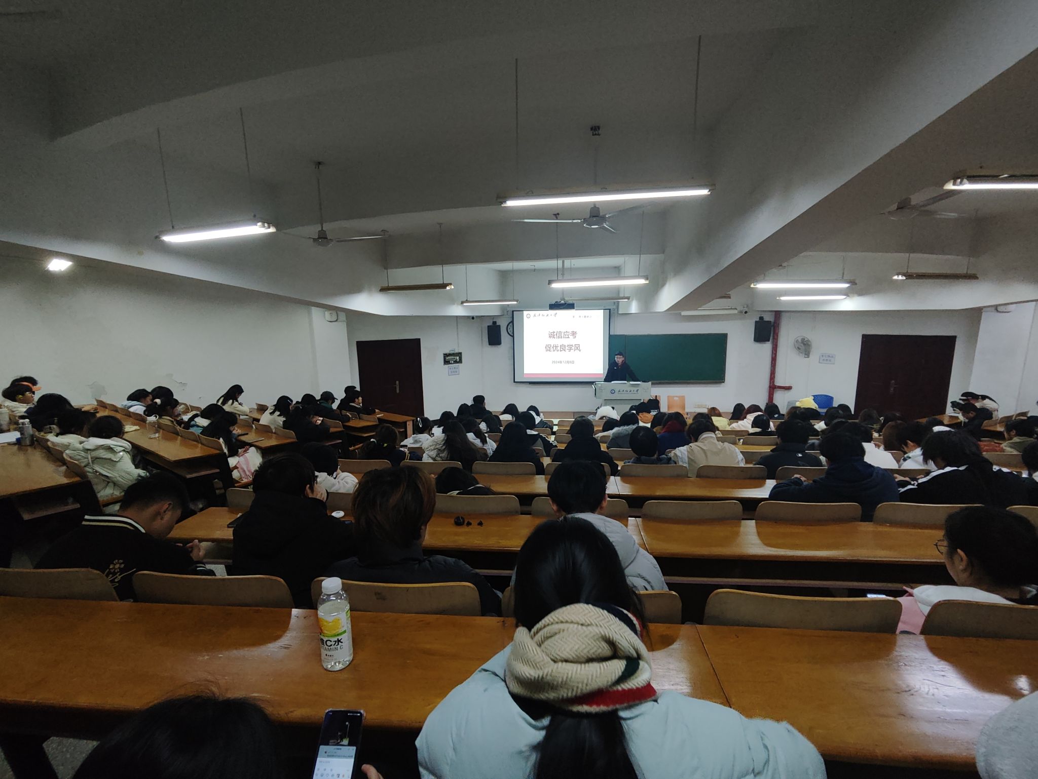 班主任强调,本学期期末考试已经陆续开展,同学们务必要对照课表逐一确认考试形式、时间、地点,避免错过考试影响毕业。随后,班主任对同学们进行了考试诚信教育,班主任通过诸多案例告知员工要严格要求自己,诚信对待考试,尤其是不能在考研中出现违纪行为。