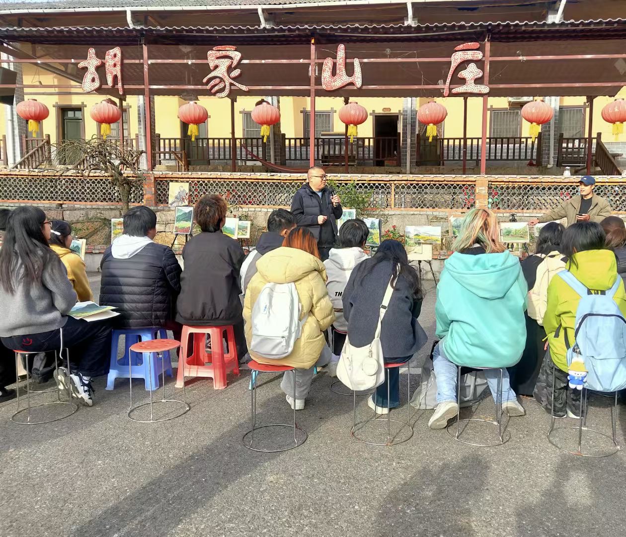 师生们与兴山县艺术家们深入胡家弯,走访村内古民居建筑群,感受传统村落的布局智慧与美学意蕴。在写生环节,大家和兴山县艺术家们一起,以艺术视角寻乡村文化根脉、画美丽乡村风光。他们以胡家湾层叠梯田、夯土民居为素材,创作了30余幅水粉作品,将非遗元素与自然景观相融合,进行了充分的艺术表达。