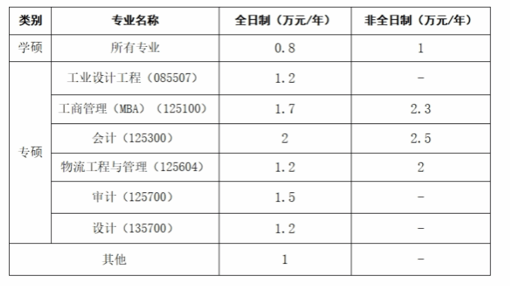 全日制研究生:学习方式为全脱产,非全日制研究生:学习方式为全脱产或半脱产;所有专业学制3年。收费标准见下表:
